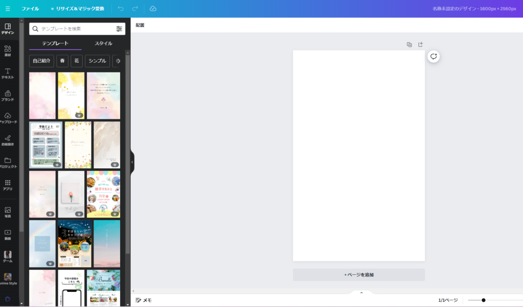 Canvaが使用できる状態になったら、以下のようにカスタムサイズの1600×2560pxでデザインを作成して下さい(このサイズが表紙のサイズとしてちょうど良いためです)。