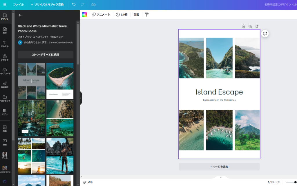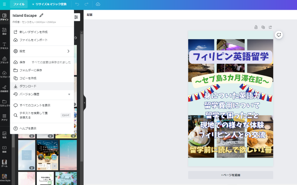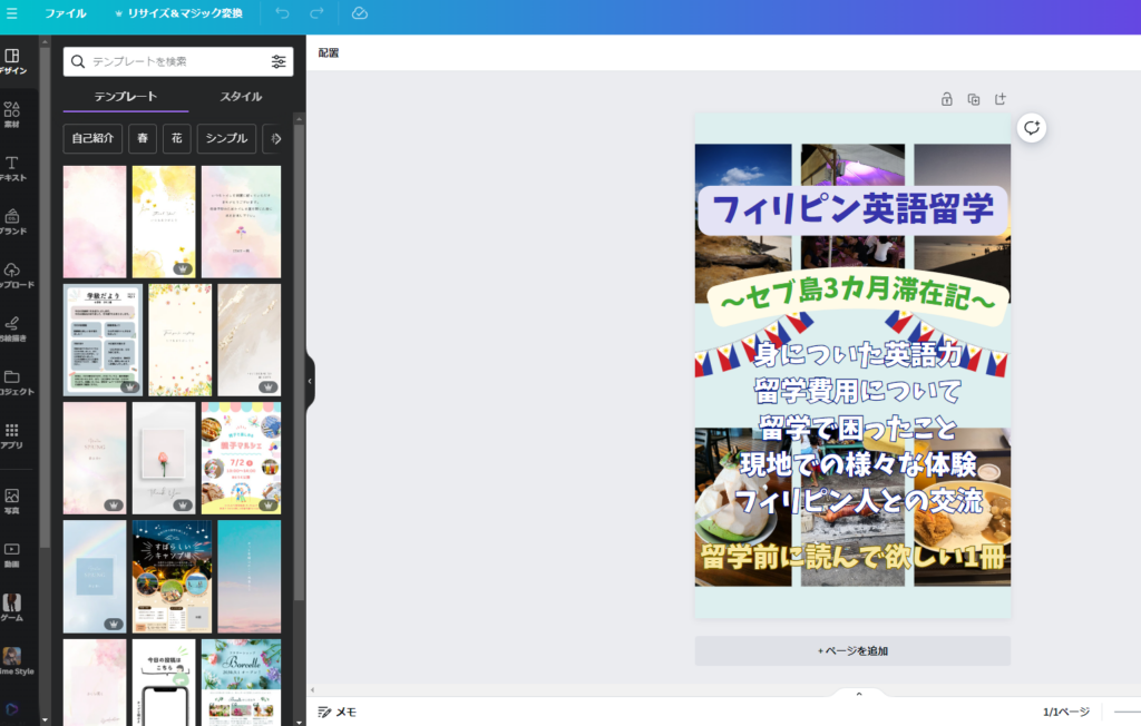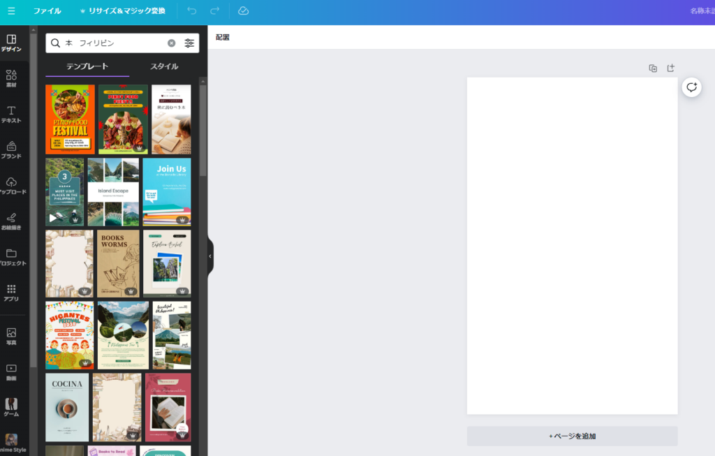 具体的に手順を説明すると、まず画面左側にある「デザイン」のタブを選択し、出てきたテンプレートに「本 フィリピン」等の好きなワードで検索を掛けます。そして、出てきたテンプレートの中で気に入ったものを選択してください。