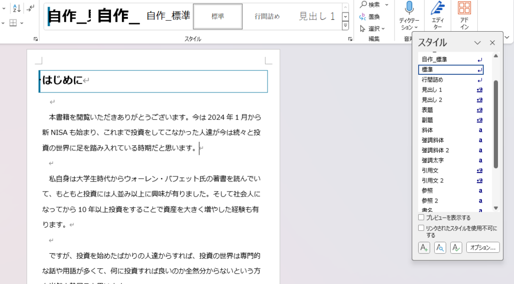 それか先にWord上で各章の見出しに使いたいスタイルを先に作っておいて、そのスタイルを上で説明した方法で見出しとして登録するということも出来ます。