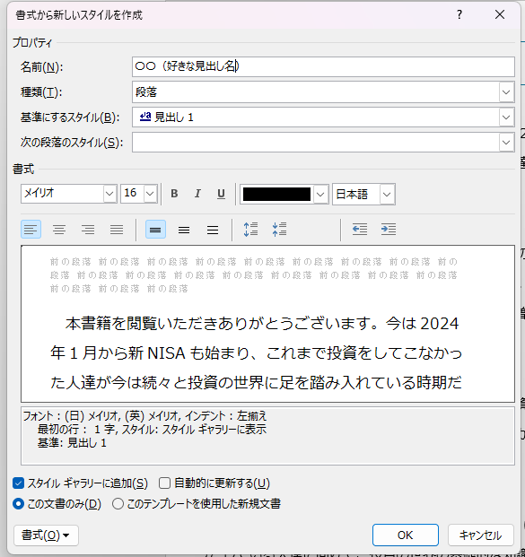 これで新しいスタイルを作成するウィンドウが立ち上がりますので、好きな書式を設定していくことになります。「名前」欄には好きな名前を入れてください。後で見出しとして使うときに分かりやすい名称であれば何でも構いません。