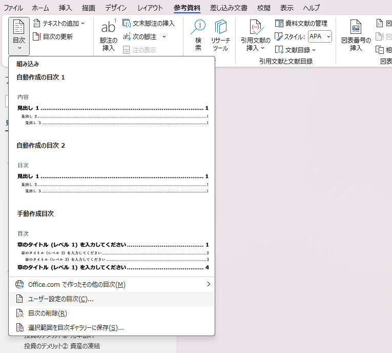続いてWord上部の「参考資料」のタブを選択し、「ユーザー設定の目次」をクリックしてください。