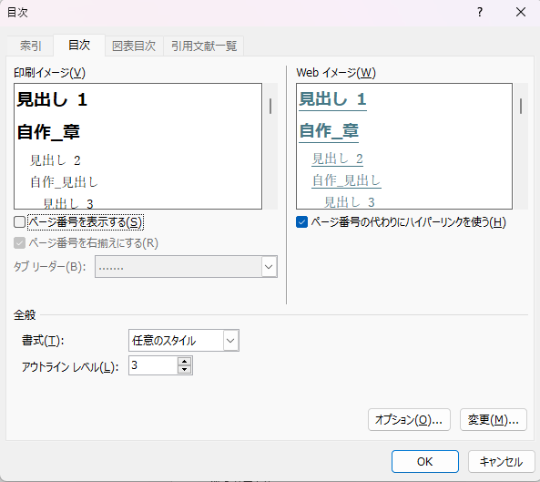 立ち上がった目次用のウィンドウの中で「ページ番号の代わりにハイパーリンクを使う」にチェックが入っていることを確認してください(入っていない場合はチェックしてください)。また、「ページ番号を表示する」のチェックは外してください。
