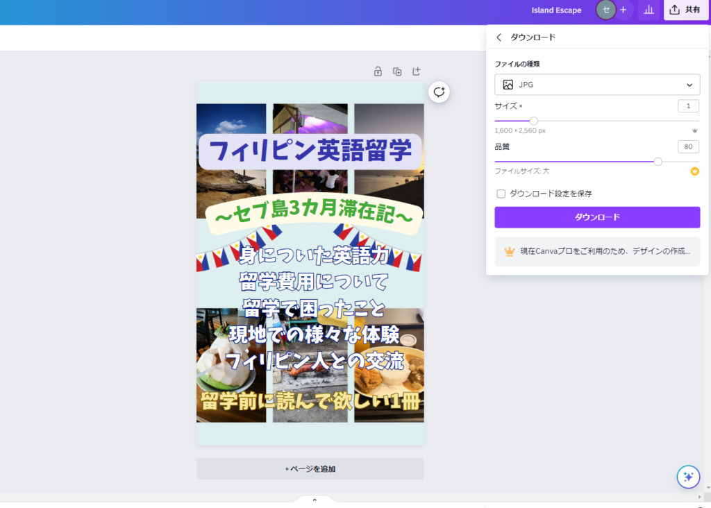そのため、私はCanvaというツールをとても気に入っており、Kindle本の作成にぜひ使ってほしいツールとして今回取り上げています。それでは最後に作成した画像をファイルとしてダウンロードしておきましょう。