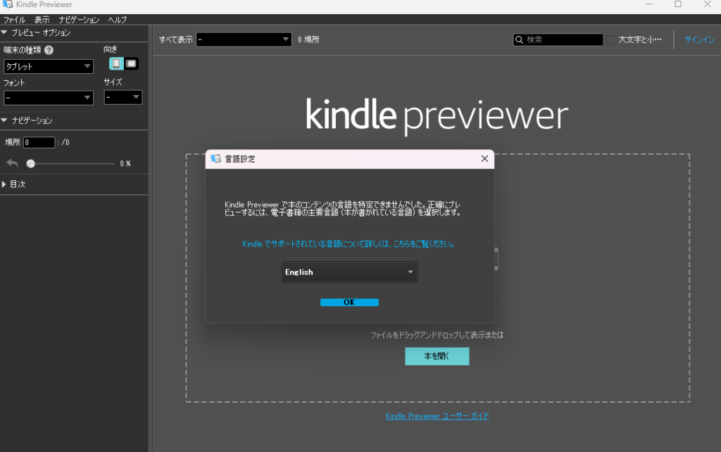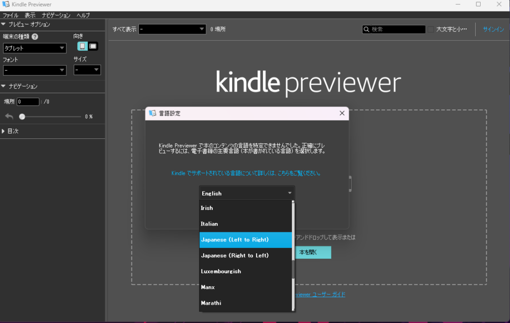 画面に表示されている通り、ツールの真ん中に作成したWordファイルをドラッグアンドドロップすれば、実際にKindleで出版した時のレイアウトが表示されます。ただし、その前に以下画像の通り、対象書籍の言語設定を行う必要があります。