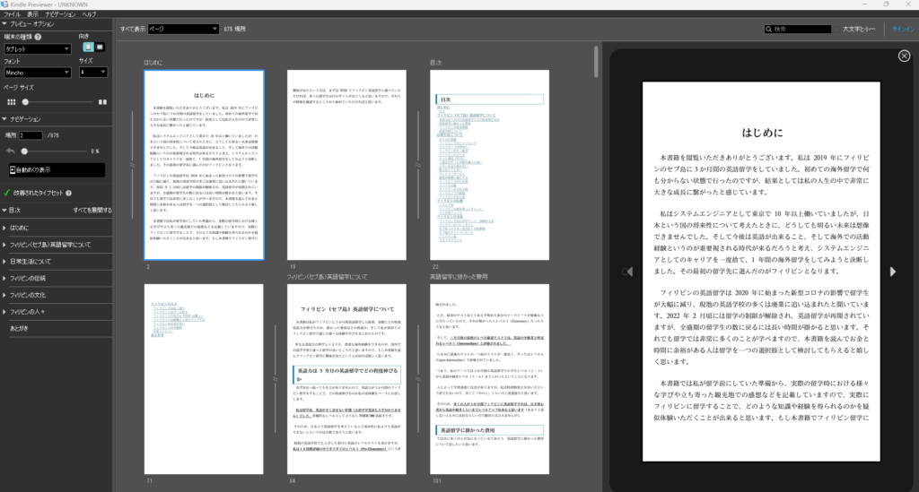 言語設定が終われば、以下のようにプレビュー画面が表示されます。この画面上で一通り前ページをチェックしていき、レイアウトが崩れていないかを確認してください。もし崩れている場合は、Wordファイルを開きなおして問題個所を修正してください。