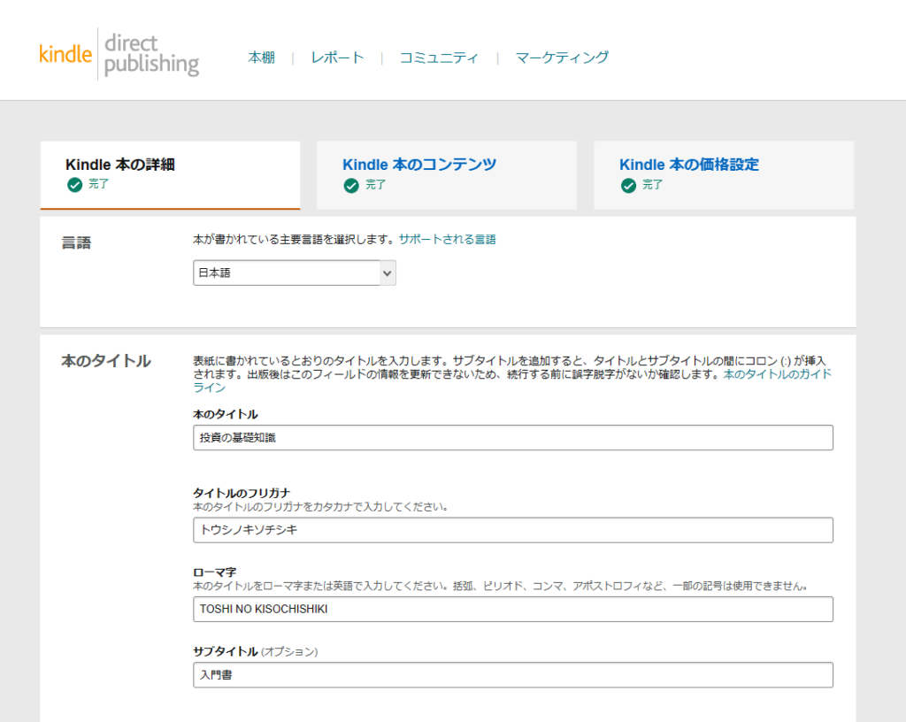 そうすると以下のように言語や本の基本情報について入力する画面が出てきます。基本的には出てきた項目にそれぞれ入力していけば特に詰まる部分はないと思います。というか私もどう入力しておくが正しいのかは若干曖昧です。