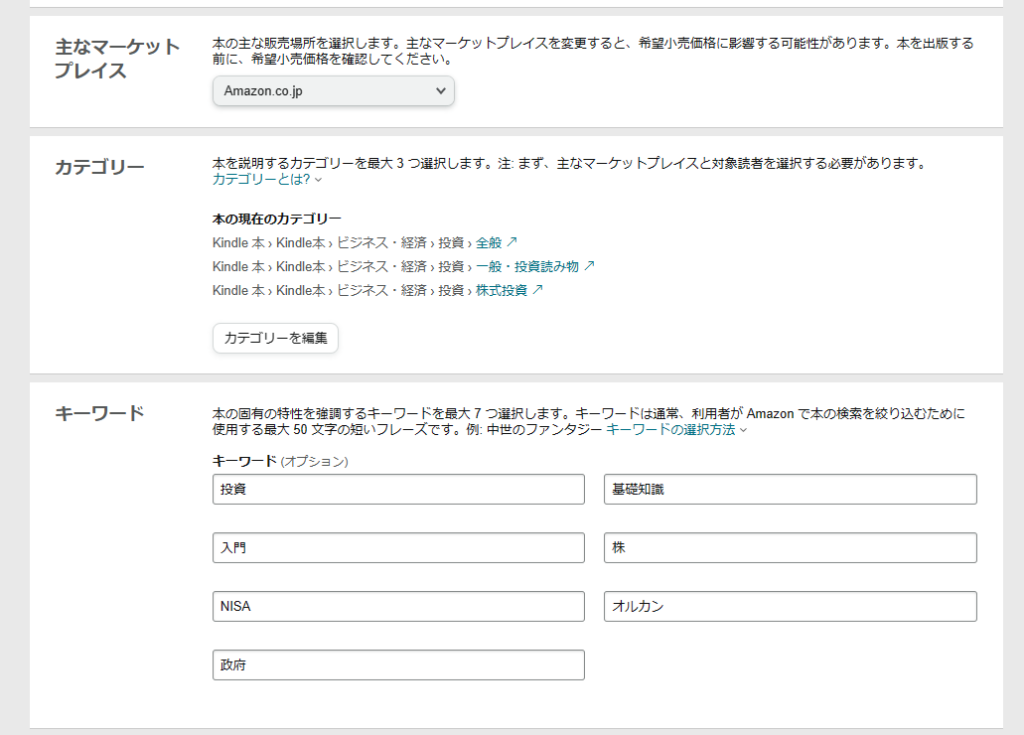 また、カテゴリーとキーワードも適切に設定しておかないと、他のユーザが検索しても本を見つけられないという状態になる可能性があります。ブログで言うならSEOのようなものですので、これらはしっかりと考えて設定しておく方が良いと思います。