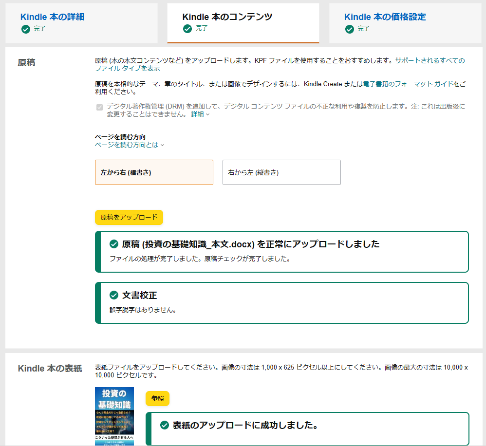 次に進むとKindle出版する本をアップロードする画面が出てきます。ここで作成しておいたWordファイルを原稿としてアップロードしてください。その次に表紙にCanvaで作成した画像をアップロードしてください。