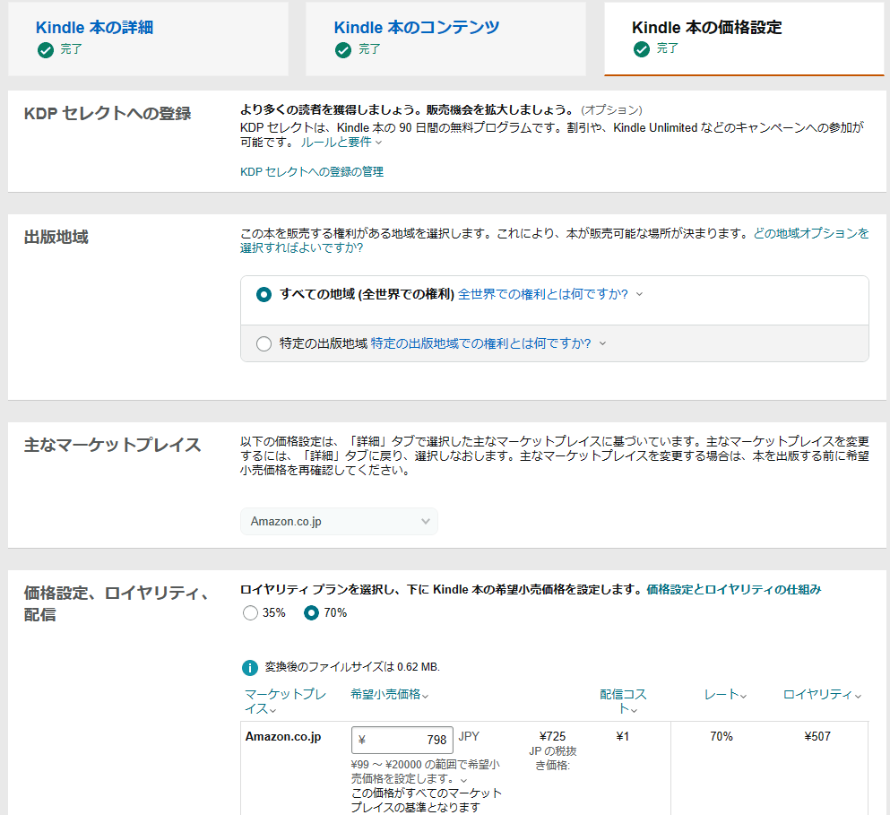 更に次へ進むとKindle本の価格設定を行うページが出てきます。ここで重要なのは「ロイヤリティプラン」の設定です。35%と70%を選択できますが、基本的に70%を選択しておく方が収入は大きくなります。