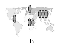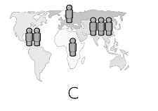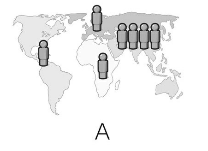 次の地図では、人の印がそれぞれ10億人を表しています。世界の人口分布を正しく表しているのは3つのうちどれでしょう?