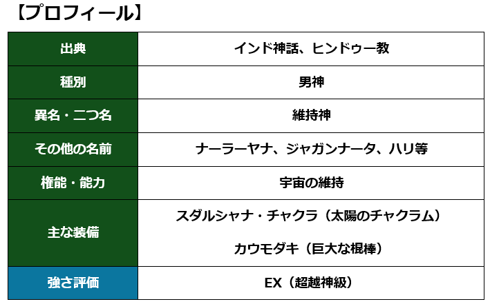 ヴィシュヌはシヴァと同格の存在とされながらも、ヴィシュヌ本人が戦うエピソードは神話上ではほとんど無く、基本的には化身がヴィシュヌの代わりに地上に降りて戦うため、シヴァと比較すると力の強さが分かりづらい部分があります。