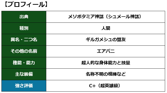 元々は暴君として君臨していたギルガメシュを諌めるために、ギルガメシュと同格の力を持った存在として神々が土を捏ねて生み出した人間とされています。