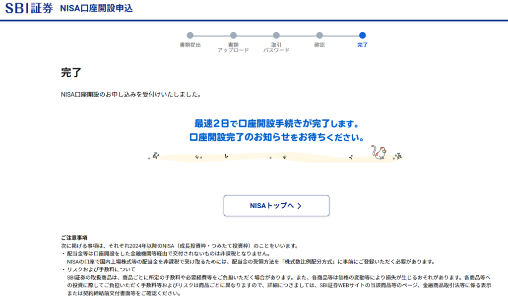 以下の通り完了画面が出れば、NISA口座の申請は完了となります。