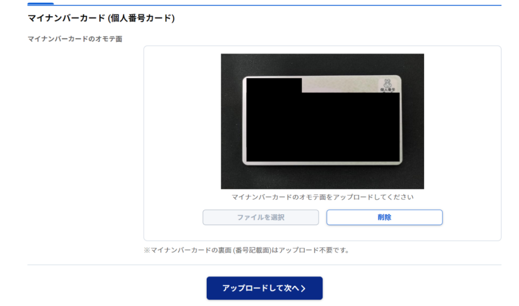 上記の通り、マイナンバーカードであれば表面のみで、裏面のアップロードは不要でした(個人情報が入っているので私の画像は黒塗りにしています)。