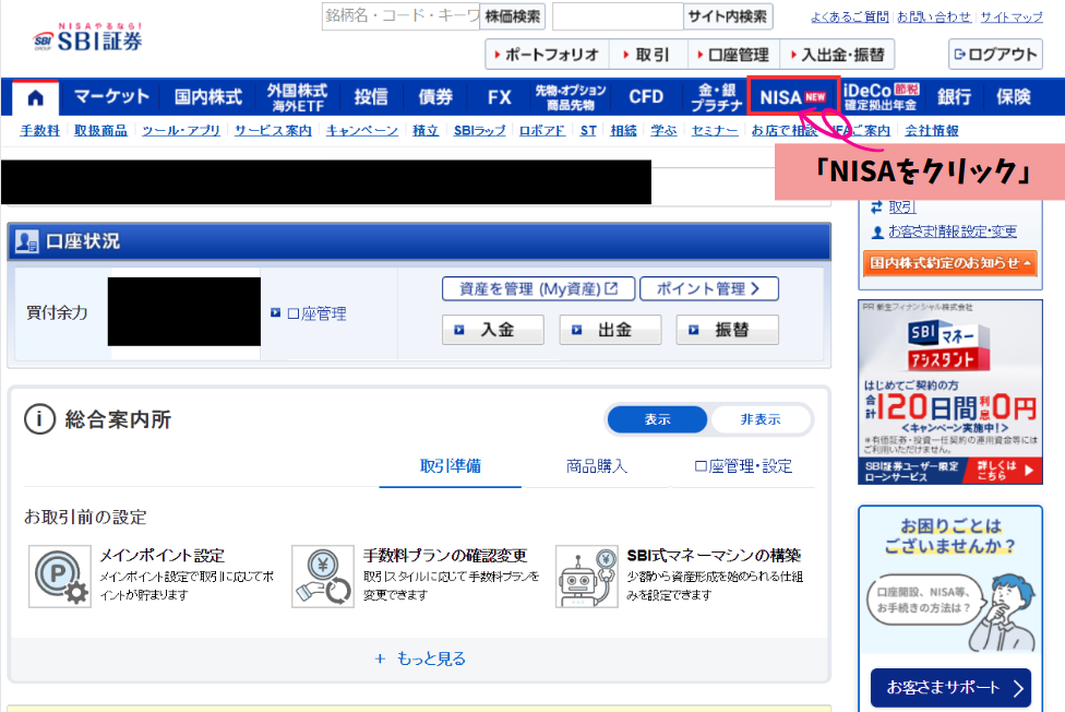NISA口座の開設手順をこれから載せていきますが、今回は既にSBIでの取引用口座(総合口座)を既に作成済みの状態で進めていきます。