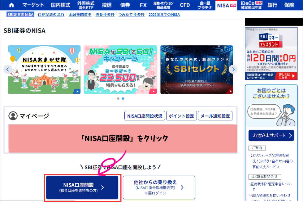 画面の中央部に「NISA口座開設」というボタンがありますので、こちらをクリックし手続きを始めましょう。