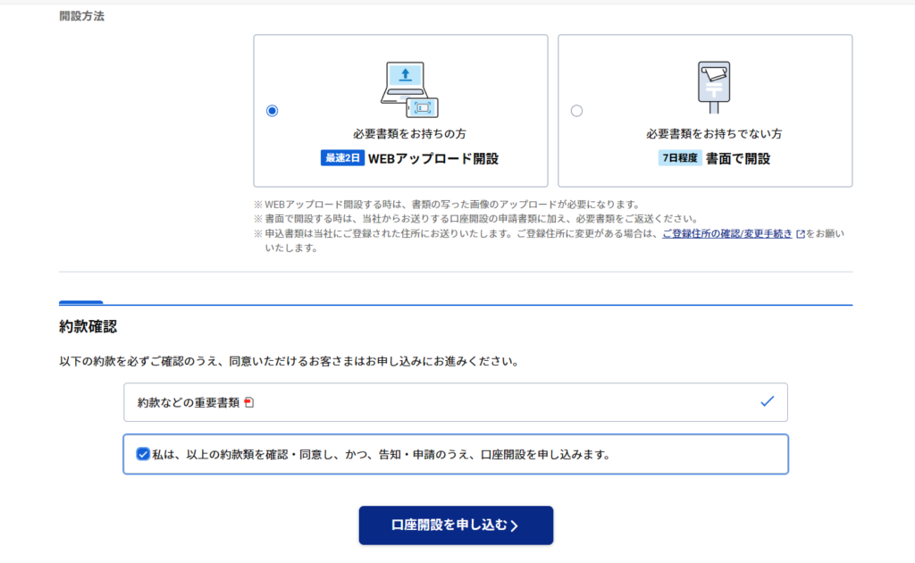 ちなみに約款確認のところでは、先に「約款などの重要書類」のリンクを押して、約款が書かれたPDFを読まなければ下のチェックが押せないようになっています。