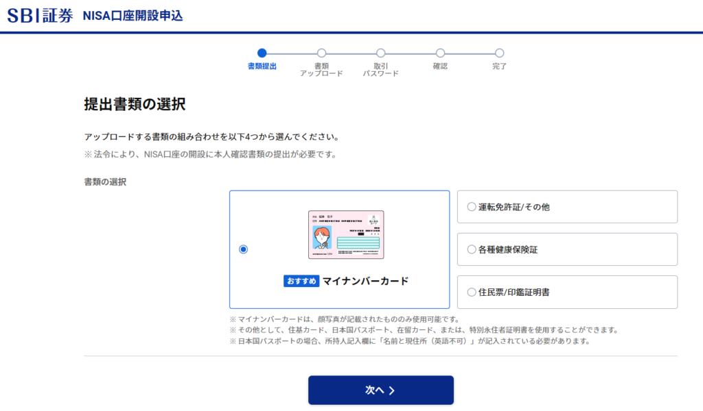 次の画面では前の画面でWEBアップロードを選択していた場合に、どの本人確認書類を提出するのかを選択する必要があります。