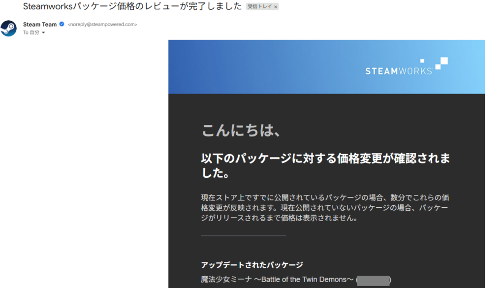 価格を変更するとSteam側でレビューが入るようです。今回は初回ですが、それも変更扱いということでレビュー対象のようですね。