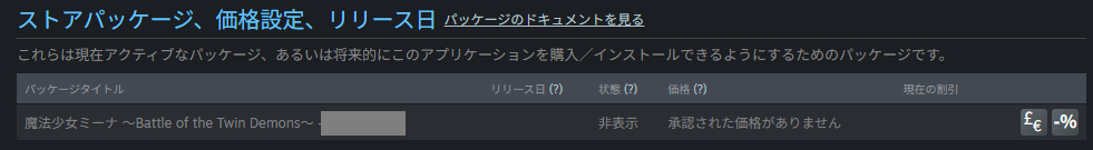 とりあえず、私が価格設定した内容はここで解説しておきます(リリースのタイミングでもう一度考え直すかも)。まず、製品版のアプリを開いて、「ストアパッケージ、価格設定、リリース日」の欄にあるアプリ名をクリックします。