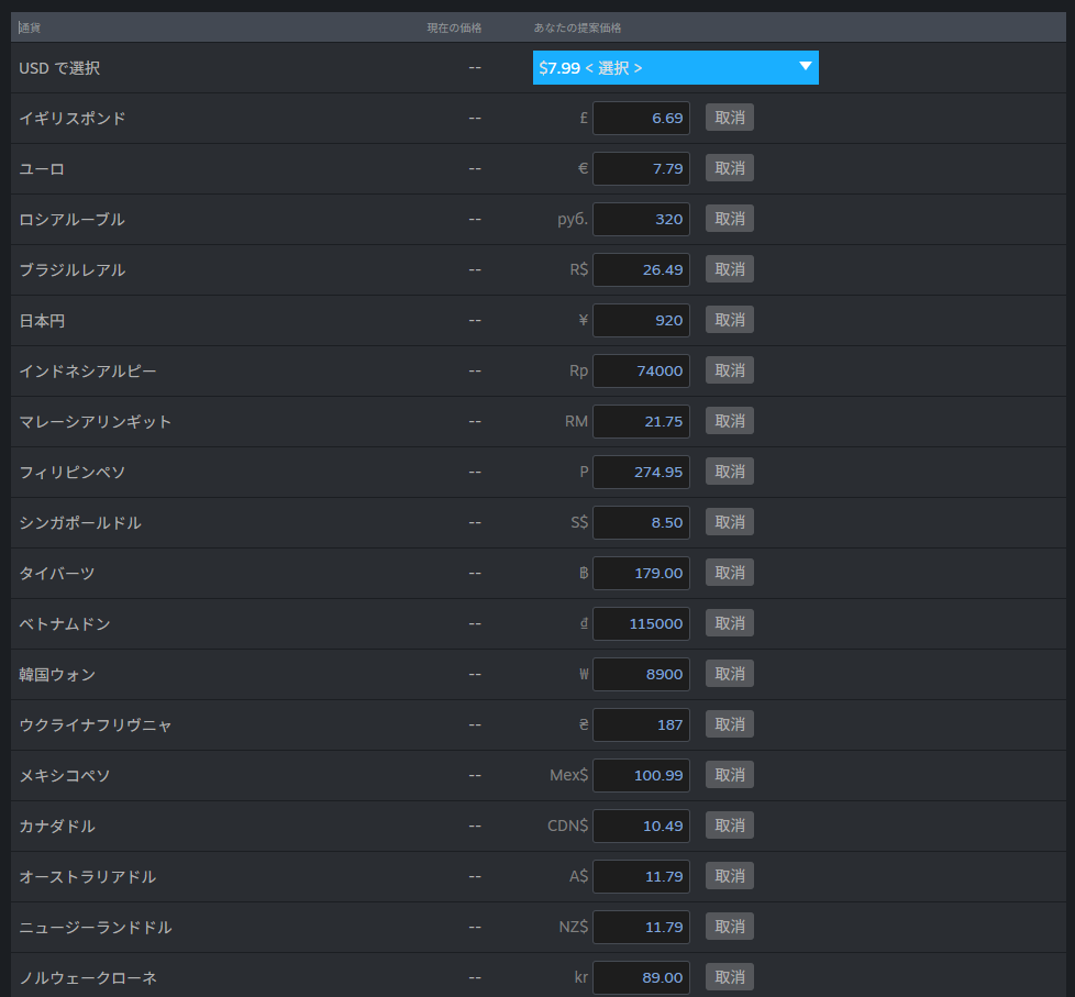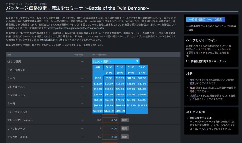 この価格設定は体験版のビルドのタイミングでは不要ですが、製品版のビルドのときには必須となります。