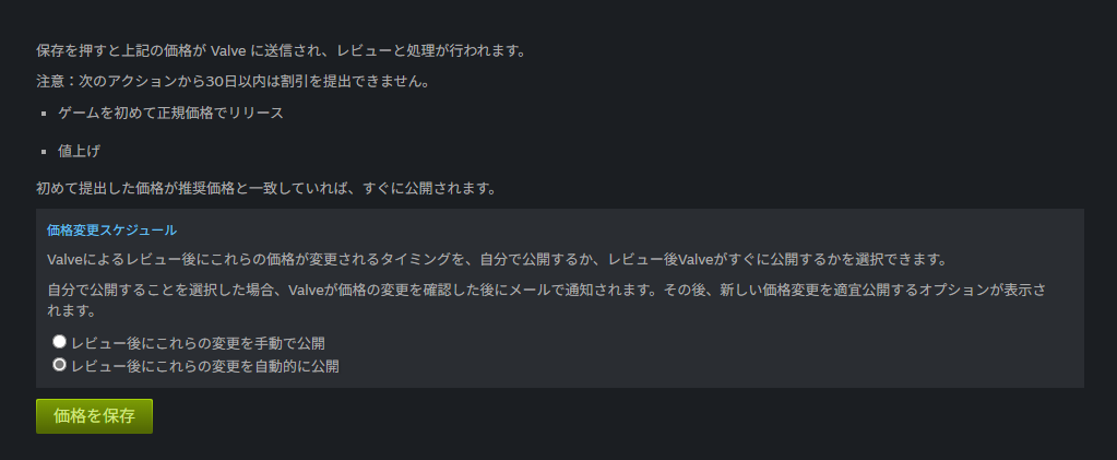 この時に価格変更のスケジュールをレビュー後に自動公開するか、手動で公開するかを選択できるのですが、手動公開は特定のタイミングで価格を変えたいという場合に使う感じですかね?価格の変更タイミングに特にこだわりがなければ、「レビュー後にこれらの変更を自動的に公開」にチェックを付けて「価格を保存」を押下してください。
