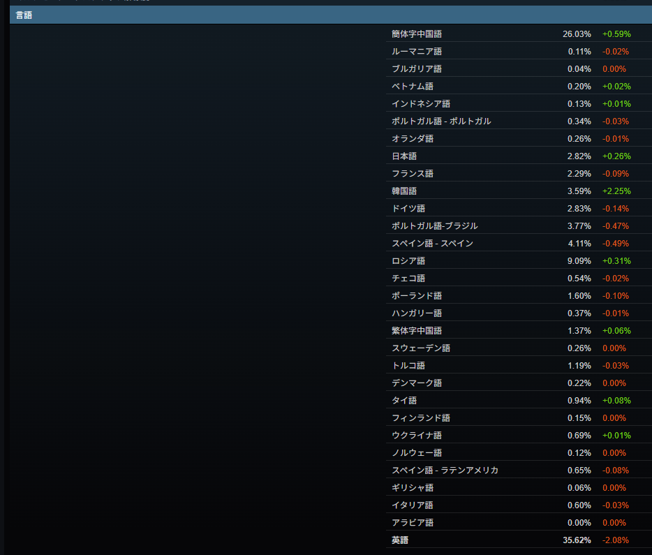 一番ユーザー数の多いのが英語で約35%、2番目の簡体字中国語が約26%となっていて、この2つの言語だけで、Steamのユーザーの60%以上を占めています。