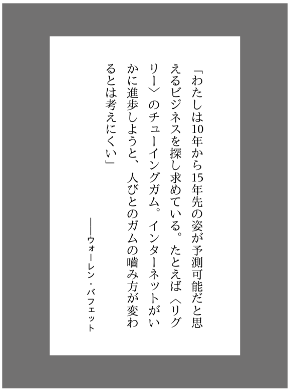 そしてこの永続的競争優位性を持つ企業に投資することできれば、それは的中率100%の予言に乗っているようなものだと断言している。